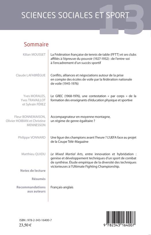 Au sommaire de ce numéro : - La Fédération française de tennis de table (FFTT) et ses clubs affiliés à l'épreuve du pouvoir (1927 - 1932) : de l'entre-soi à l'encadrement d'un succès sportif. - Conflits, alliances et négociations autour de la prise en compte des écoles de voile par la fédération nationale de voile (1945 - 1976). - Le GREC (1968 -1976), une contestation "par corps" de la formation des enseignants d'éducation physique et sportive. - Accompagnateur en moyenne montagne, un règime de genre égalitaire ? - Une ligue des champions avant l'heure ? l'UEFA face au projet de la Coupe Télé-Magazine. - Le Mixed Martial Arts, entre innovation et hybridation : genèse et développement techniques d'un sport de combat de synthèse. Etude empirique de la diversité des techniques victorieuses à l'Ultimate Fighting Championship.