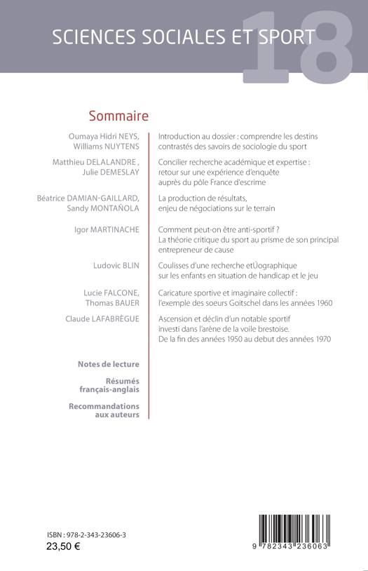 Introduction au dossier: comprendre les destins contrastés des savoirs de sociologie du sport; Concilier recherche académique et expertise: retour sur une expérience d'enquête auprès du pôle France d'escrime; La production de résultats, enjeu de négociations sur le terrain; Comment peut-on être anti-sportif ? La théorie critique du sport au prisme de son principal entrepreneur de cause; Coulisses d'une recherche ethnographique sur les enfants en situation de handicap et le jeu; Caricature sportive et imaginaire collectif: l'exemple des soeurs Goitschel dans les années 1960; Ascension et déclin d'un notable sportif investi dans l'arène de la voile brestoise. De la fin des années 1950 au début des années 1970.