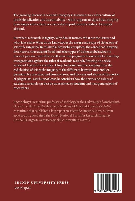 The growing attention for scientific integrity is part of a wider culture of professionalization and accountability − which appears to signal that integrity is no longer self-evident as a core value of professional conduct. Examples abound. But what is scientific integrity? Why does it matter? What are the issues, and what is at stake? What do we know about the nature and scope of violations of scientific integrity? In this book, Kees Schuyt explores the concept of integrity, describes various cases of fraud and other types of dishonest behaviour in research practice, and offers a reflective and pragmatic framework for handling transgressions against the rules of academic research. Drawing on a wide variety of historical examples, Schuyt looks into matters ranging from the codification of scientific integrity to the difference between misconduct, questionable practices, and honest errors, and the uses and abuses of the notion of plagiarism. Last but not least, he considers how the norms and values of academic research can best be transmitted to students and new generations of researchers.