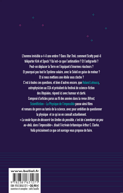 C’est à toutes ces questions, et bien d’autres encore, que Roland Lehoucq, astrophysicien au CEA et président du festival de science-fiction des Utopiales, répond ici avec humour et clarté, passant films et romans de genre au tamis de la science, avec pour ambition de questionner la physique et ce qu’on en connaît actuellement.