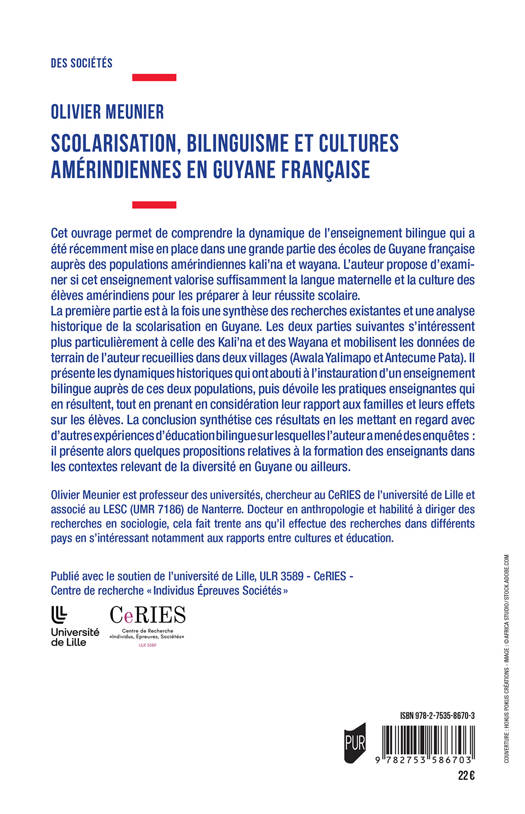 Cet ouvrage permet de comprendre la dynamique de l'enseignement bilingue qui a été récemment mise en place dans une grande partie des écoles de Guyane française auprès des populations amérindiennes kali'na et wayana. L'auteur propose d'examiner si cet enseignement valorise suffisamment la langue maternelle et la culture des élèves amérindiens pour les préparer à leur réussite scolaire.