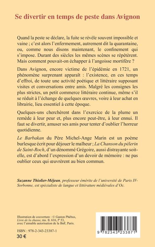 Quand la peste se déclare, la fuite se révèle souvent impossible et vaine; c'est alors l'enfermement, autrement dit la quarantaine, ou, comme nous disons maintenant, le confinement qui s'impose. Mais comment pouvait-on échapper à l'angoisse mortifère ? Dans Avignon, encore victime de l'épidémie en 1721, il existe toute une activité poétique et littéraire supposant visites et conversations entre amis. Malgré les consignes strictes, un petit commerce littéraire continue, même s'il se réduit à l'échange de quelques oeuvres, voire à leur achat en librairie, lieu essentiel à cette époque. Quelques-uns cherchèrent dans l'exercice de la plume un remède à leur peur et, plus encore peut-être, à leur ennui. Il faut se divertir, amuser ses amis pour tenter d'oublier l'horreur quotidienne.
