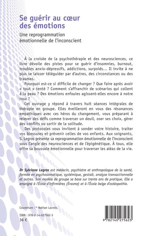 À la croisée de la psychothérapie et des neurosciences, ce livre dévoile des pistes pour se guérir d'insomnies, burnout, troubles anxio-dépressifs, addictions, surpoids... Il invite à ne plus se laisser téléguider par d'autres, des circonstances ou des traumas. Pourquoi est-ce si difficile de changer ? Que faire après avoir tout tenté ? Comment s'affranchir de scénarios qui collent à la peau ? Des émotions enfouies agissent-elles encore à notre insu ? Cet ouvrage y répond à travers huit séances intégrales de thérapie en groupe. Elles éveilleront en vous des résonances empathiques avec ces héros du changement, vous préparant à relever des défis comme traverser un deuil, oser ses choix, gérer des conflits ou sortir de la solitude. Des protocoles vous invitent à sonder votre histoire, traiter vos blessures et prévenir celles de vos enfants. Aux soignants, S. Legros présente sa reprogrammation émotionnelle de l'inconscient sous l'angle des neurosciences et de l'épigénétique. À tous, elle offre sa boussole émotionnelle pour traverser les aléas de la vie.