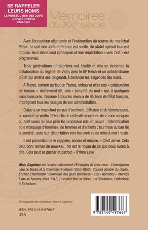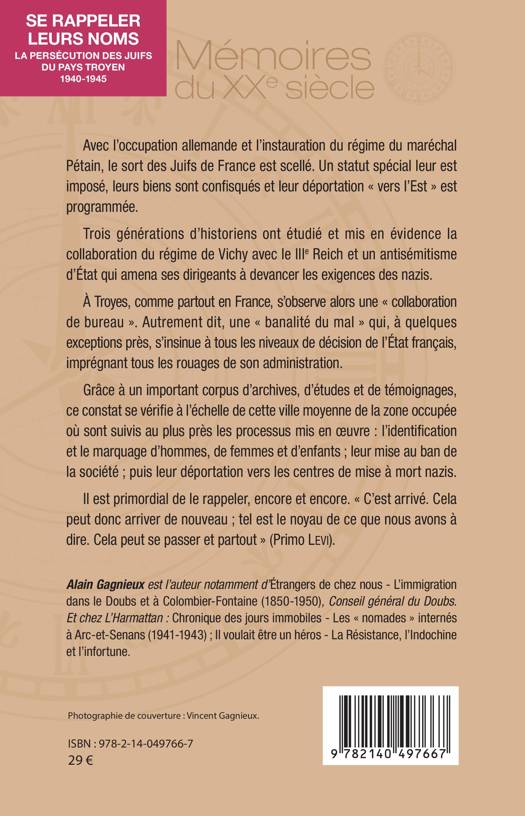 Avec l'occupation allemande et l'instauration du régime du maréchal Pétain, le sort des Juifs de France est scellé. Un statut spécial leur est imposé, leurs biens sont confisqués et leur déportation « vers l'Est » est programmée. Trois générations d'historiens ont étudié et mis en évidence la collaboration du régime de Vichy avec le IIIe Reich et un antisémitisme d'État qui amena ses dirigeants à devancer les exigences des nazis. À Troyes, comme partout en France, s'observe alors une « collaboration de bureau ». Grâce à un important corpus d'archives, d'études et de témoignages, ce constat se vérifie à l'échelle de cette ville moyenne de la zone occupée où sont suivis au plus près les processus mis en uvre : l'identification et le marquage d'hommes, de femmes et d'enfants ; leur mise au ban de la société ; puis leur déportation vers les centres de mise à mort nazis. Il est primordial de le rappeler, encore et encore. « C'est arrivé. Cela peut donc arriver de nouveau ; tel est le noyau de ce que nous avons à dire. Cela peut se passer et partout » (Primo Levi).