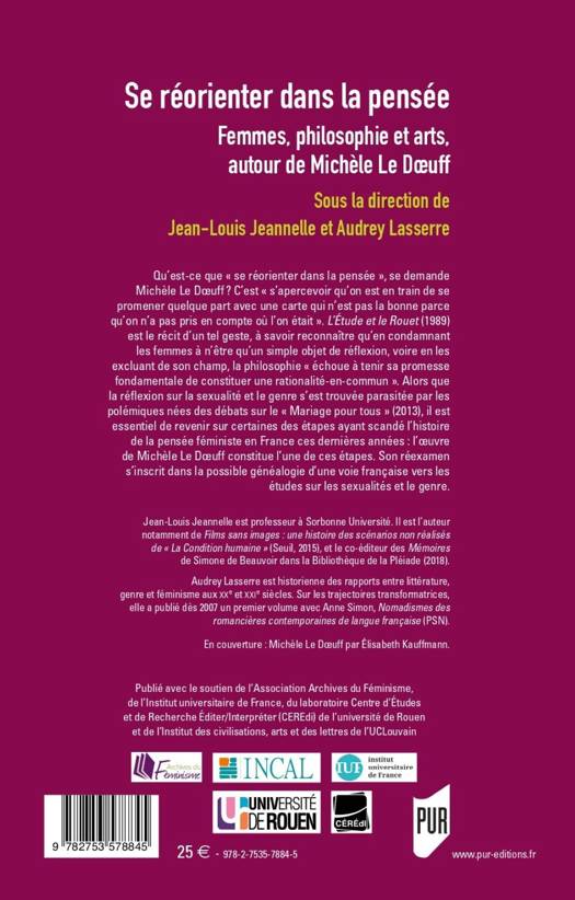 Qu'est-ce que "se réorienter dans la pensée", se demande Michèle Le Doeuff ? C'est "s'apercevoir qu'on est en train de se promener quelque part avec une carte qui n'est pas la bonne parce qu'on n'a pas pris en compte où l'on était". L'Étude et le Rouet (1989) est le récit d'un tel geste, à savoir reconnaître qu'en condamnant les femmes à n'être qu'un simple objet de réflexion, voire en les excluant de son champ, la philosophie "échoue à tenir sa promesse fondamentale de constituer une rationalité-en-commun". Alors que la réflexion sur la sexualité et le genre s'est trouvée parasitée par les polémiques nées des débats sur le "Mariage pour tous" (2013), il est essentiel de revenir sur certaines des étapes ayant scandé l'histoire de la pensée féministe en France ces dernières années : l'oeuvre de Michèle Le Doeuff constitue l'une de ces étapes. Son réexamen s'inscrit dans la possible généalogie d'une voie française vers les études sur les sexualités et le genre.