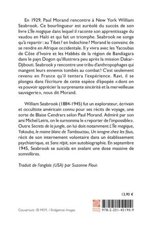 En 1929, Paul Morand rencontre a New York William Seabrook. Ce bourlingueur est aureole du succes de son livre L'Ile magique dans lequel il raconte son apprentissage du vaudou en Haiti et qui fait un triomphe. Seabrook ne songe qu'a repartir: au Tibet ? en Indochine ? Morand le convainc de se rendre en Afrique occidentale. Il y vivra avec les Yacoubas de Cote d'Ivoire et les Habbes de la region de Bandiagara dans le pays Dogon qu'illustrera peu apres la mission Dakar-Djibouti. Seabrook y rencontre une tribu d'anthropophages qui mangent leurs ennemis tombes au combat ! C'est seulement revenu en France qu'il tentera l'experience. Ravi, il se plongea dans l'ecriture de cette espece d'epopee dont on va pouvoir apprecier la surprenante sincerite et la merveilleuse sauvagerie , nous dit Morand.