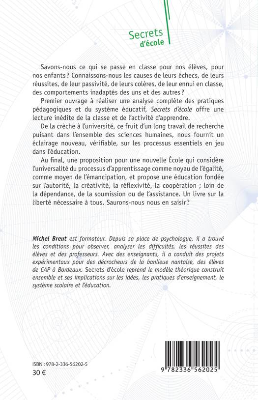 Savons-nous ce qui se passe en classe pour nos élèves, pour nos enfants ? Connaissons-nous les causes de leurs échecs, de leurs réussites, de leur passivité, de leurs colères, de leur ennui en classe, des comportements inadaptés des uns et des autres ? Premier ouvrage à réaliser une analyse complète des pratiques pédagogiques et du système éducatif, Secrets d'école offre une lecture inédite de la classe et de l'activité d'apprendre. De la crèche à l'université, ce fruit d'un long travail de recherche puisant dans l'ensemble des sciences humaines, nous fournit un éclairage nouveau, vérifiable, sur les processus essentiels en jeu dans l'éducation. Au final, une proposition pour une nouvelle École qui considère l'universalité du processus d'apprentissage comme noyau de l'égalité, comme moyen de l'émancipation, et propose une éducation fondée sur l'autorité, la créativité, la réflexivité, la coopération, loin de la dépendance, de la soumission ou de l'assistance. Un livre sur la liberté nécessaire à tous. Saurons-nous nous en saisir ?