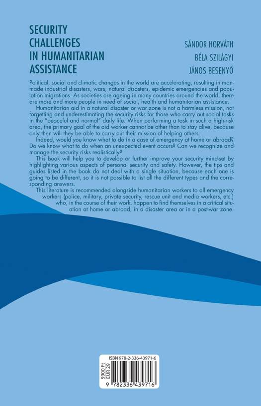 Political, social and climatic changes in the world are accelerating, resulting in man-made industrial disasters, wars, natural disasters, epidemic emergencies and population migrations. As societies are ageing in many countries around the world, there are more and more people in need of social, health and humanitarian assistance. Humanitarian aid in a natural disaster or war zone is not a harmless mission, not forgetting and underestimating the security risks for those who carry out social tasks in the “peaceful and normal” daily life. When performing a task in such a high-risk area, the primary goal of the aid worker cannot be other than to stay alive, because only then will they be able to carry out their mission of helping others. Indeed, would you know what to do in a case of emergency at home or abroad? Do we know what to do when an unexpected event occurs? Can we recognize and manage the security risks realistically? This book will help you to develop or further improve your security mind-set by highlighting various aspects of personal security and safety. However, the tips and guides listed in the book do not deal with a single situation, because each one is going to be different, so it is not possible to list all the different types and the corresponding answers. This literature is recommended alongside humanitarian workers to all emergency workers (police, military, private security, rescue unit and media workers, etc.) who, in the course of their work, happen to find themselves in a critical situation at home or abroad, in a disaster area or in a post-war zone.