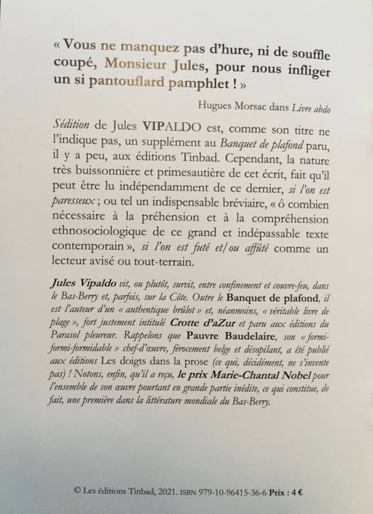 "Sédition" de Jules Vipaldo est, comme son titre ne l'indique pas, un supplément au "Banquet de lafond paru, il y a peu, aux éditions Tinbad. Cependant, la nature très buissonnière et primesautière de cet écrit, fait qu'il peut être lu indépendamment de ce dernier, 'si l'on est paresseux' ; ou tel un indispensable bréviaire, "ô combien nécessaire à la préhension et à la compréhension ethnosociologique de ce grand et indépassable texte contemporain", 'si l'on est futé et/ou affûté' comme un lecteur avisé ou tout-terrain.