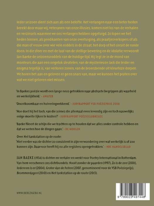 Ieder seizoen dient zich aan als een belofte. Het verlangen naar een beter heden breekt door maar wij, veteranen van onze illusies, komen niet los van de verhalen en verzinsels waarmee we ons verlangen hebben opgetuigd. Zo lopen we het heden binnen, als predikanten van onze overtuiging, als praatjesverkopers of als die man of vrouw over wie vele roddels in de straat, het dorp of het circuit de ronde doen. In die sfeer en met de taal van de stellige bewering en de idolatie verwoordt Jan Baeke de seizoensroddels van de huidige tijd. Hij legt ze in de mond van monteurs die aan een ongeluk sleutelen, van de mysterieuze Jack die leider en enigma tegelijk is, van verloren zonen, van de broersbende uit kleurloze dorpen. We horen het aan en geloven er geen snars van, maar we kunnen het praten over wat we niet geloven niet missen.
