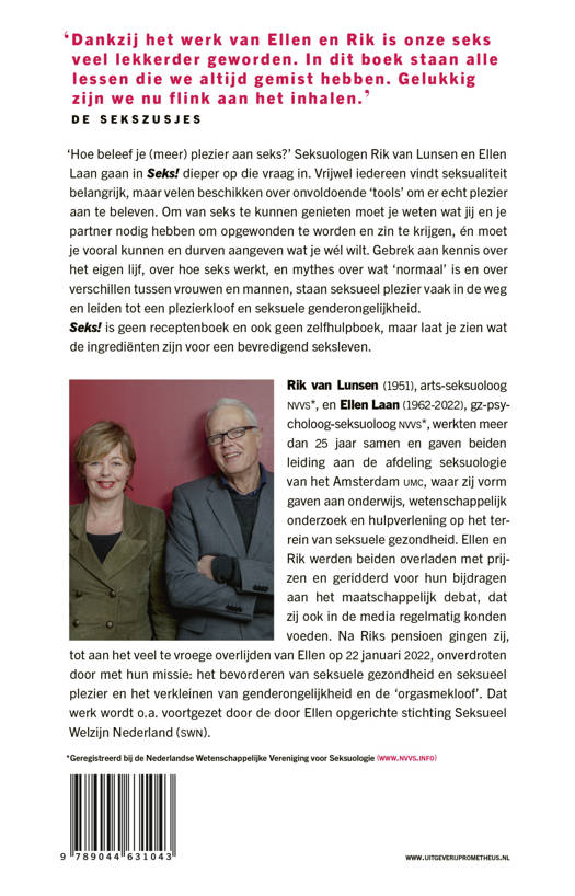 Rik van Lunsen (1951), arts-seksuoloog NVVS* en Ellen Laan (1962-2022), gz-psycholoog–seksuoloog NVVS*, werkten meer dan 25 jaar samen en gaven beiden leiding aan de afdeling seksuologie van het Amsterdam UMC, waar zij vorm gaven aan onderwijs, wetenschappelijk onderzoek en hulpverlening op het terrein van seksuele gezondheid. Ellen en Rik werden beiden overladen met prijzen en geridderd voor hun bijdragen aan het maatschappelijk debat, dat zij ook in de media regelmatig konden voeden. Na Riks pensioen gingen zij, tot aan het veel te vroege overlijden van Ellen op 22 januari 2022, onverdroten door met hun missie: het bevorderen van seksuele gezondheid en seksueel plezier en het verkleinen van genderongelijkheid en de ‘orgasmekloof’. Dat werk wordt o.a. voortgezet door de door Ellen opgerichte stichting Seksueel Welzijn Nederland (SWN).