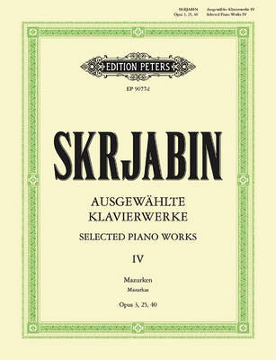 Alexander Scriabin composed sets of Études throughout his life in all periods of his compositional development. These pieces push the technical limits while finding new musical and poetic vistas. This edition is volume 4 of his Selected Piano Works, including Mazurkas (Op. 3, 25 and 40) which have been prepared by Günter Philipp. It contains an authoritative text of the notation, preface in German and English, and a critical commentary.