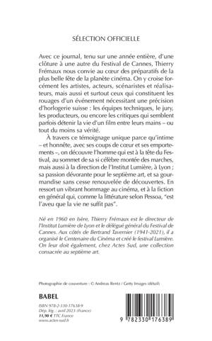 Avec ce journal, tenu sur une année entière, d'une clôture à une autre du Festival de Cannes, Thierry Frémaux nous convie au coeur des préparatifs de la plus belle fête de la planète cinéma. On y croise forcément les artistes, acteurs, scénaristes et réalisateurs, mais aussi et surtout ceux qui constituent les rouages d'un événement nécessitant une précision d'horlogerie suisse : les équipes techniques, le jury, les producteurs, ou encore les critiques qui semblent parfois détenir la vie d'un film entre leurs mains - ou tout du moins sa vérité. À travers ce témoignage unique parce qu'intime - et honnête, avec ses coups de coeur et ses emportements -, on découvre l'homme qui est à la tête du Festival, au sommet de sa si célèbre montée des marches, mais aussi à la direction de l'Institut Lumière, à Lyon ; sa passion dévorante pour le septième art, et sa gourmandise sans cesse renouvelée de découvertes. En ressort un vibrant hommage au cinéma, et à la fiction en général qui, comme la littérature selon Pessoa, "est l'aveu que la vie ne suffit pas".