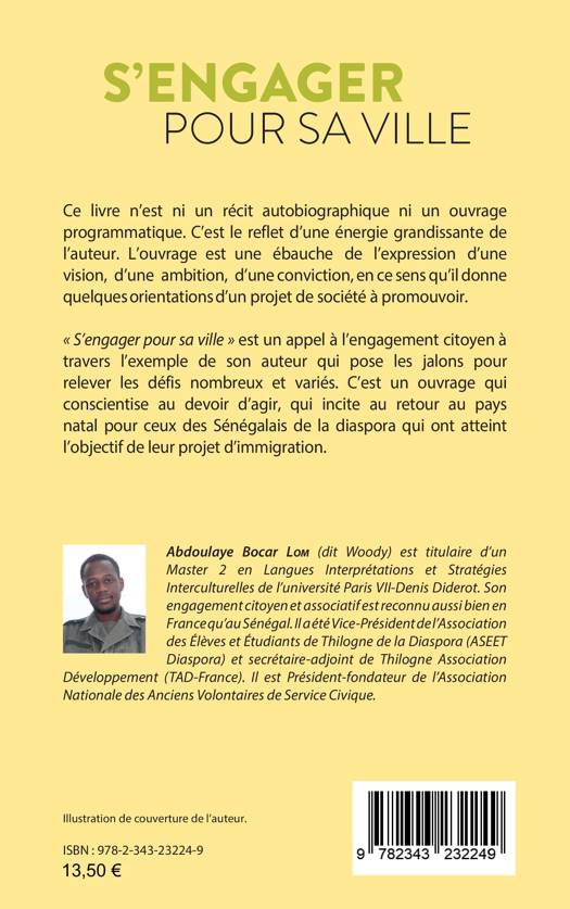 S'engager pour sa ville est un appel à l'engagement citoyen à travers l'exemple de son auteur qui pose les jalons pour relever les défis nombreux et variés. C'est un ouvrage qui conscientise au devoir d'agir, qui incite au retour au pays natal pour ceux des Sénégalais de la diaspora qui ont atteint l'objectif de leur projet d'immigration.