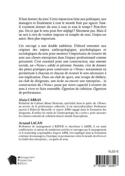 Il faut donner du sens ! Cette injonction faite aux politiques, aux managers et finalement à tout le monde finit par agacer. Faut-il vraiment donner du sens à tout et tout le temps ? Peut-être pas. Est-ce que le sens peut être négligé ? Sûrement pas. Mais il ne sert à rien de vouloir imposer et remplir de sens. L’enjeu est autre. Bien plus important. Cet ouvrage a une double ambition. D’abord remonter aux origines des enjeux anthropologiques, psychologiques et sociologiques du sens pour montrer l’importance de trouver du sens aux choses entreprises dans l’espace professionnel comme personnel. C’est essentiel pour une construction, une entente sociale, un « Nous », solide et pérenne. Ensuite, c’est de donner des pistes pratiques pour construire ce « Nous » notamment en permettant à chacune et chacun de trouver le sens nécessaire à son implication. Dans un club de sport, une troupe de théâtre, un club de dirigeants, une école ou encore une entreprise… la construction du « Nous » passe par notre capacité à trouver du sens à vivre et faire ensemble. Question de cohésion. Question de performance.