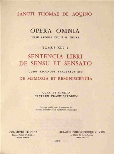 L'édition donne le texte critique des commentaires de saint Thomas sur les traités psychologiques d'Aristote ainsi que celui des traductions latines de ce dernier qui sont des recensions partielles des révisions de Guillaume de Moerbeke. L'édition s'efforce de situer l'oeuvre dans son contexte historique (éd. R.-A. GAUTHIER).