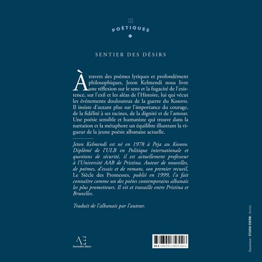 À travers des poèmes lyriques et profondément philosophiques, Jeton Kelmendi nous livre une réflexion sur le sens et la fugacité de l'existence, sur l'exil et les aléas de l'Histoire, lui qui vécut les événements douloureux de la guerre du Kosovo. Il insiste d'autant plus sur l'importance du courage, de la fidélité à ses racines, de la dignité et de l'amour. Une poésie sensible et humaniste qui trouve dans la narration et la métaphore un équilibre illustrant la vigueur de la jeune poésie albanaise actuelle.Jeton Kelmendi est né en 1978 à Peja au Kosovo. Diplômé de l'ULB en Politique internationale et questions de sécurité, il est actuellement professeur à l'Université AAB de Pristina. Auteur de nouvelles, de poèmes, d'essais et de romans, son premier recueil, Le Siècle des Promesses, publié en 1999, l'a fait connaître comme un des poètes contemporains albanais les plus prometteurs. Il vit et travaille entre Pristina et Bruxelles.Traduit de l'albanais par l'auteur.