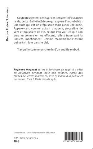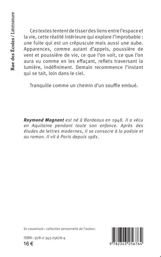 Ces textes tentent de tisser des liens entre l’espace et la vie, cette réalité intérieure qui explore l’improbable : une fuite qui est un crépuscule mais aussi une aube. Apparences, comme autant d’appels, poussière de vent et poussière de vie, ce que l’on voit, ce que l’on aura vu comme en les effaçant, reflets traversant la lumière, indéfiniment. Demain recommence l’instant qui se tait, loin dans le ciel.Tranquille comme un chemin d’un souffle embué.