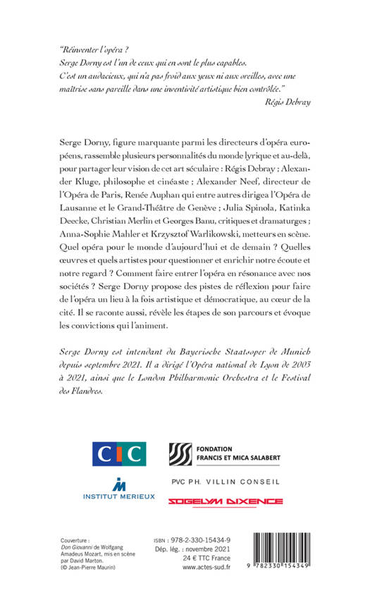En quoi l'opéra est-il essentiel à nos vies ? Serge Dorny, intendant du Bayerische Staatsoper de Munich depuis 2021, après avoir dirigé l'Opera de Lyon depuis 2003, retrace quelques étapes de sa carrière et invite dix personnalités parmi les lesquelles Régis Debray, Alexander Neef, Anna-Sophie Mahler ou encore Krzysztof Warlikowski à questionner l'avenir de cet art séculaire et à partager leur vision de l'opéra d'aujourd'hui et de demain.