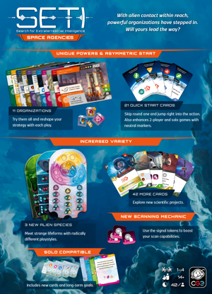SETI: Space Agencies is an expansion for SETI: Search for Extraterrestrial Intelligence that introduces powerful asymmetric organizations—each with unique abilities, strategic advantages, and starting conditions that redefine how you approach the search for alien life.