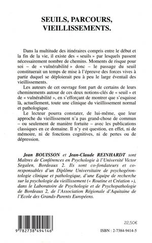Dans la multitude des itinéraires compris entre le début et la fin de la vie, il existe des " seuils " par lesquels passent nécessairement nombre de chemins. Moments de risque pour soi - de vulnérabilité " donc - le passage du seuil constituerait un temps de mise à l'épreuve des forces vives à partir duquel se déploierait peu à peu le large éventail des vieillissements. Les auteurs de cet ouvrage font part de leurs cheminements autour de ces deux notions-clés de " seuil " et de " vulnérabilité ".