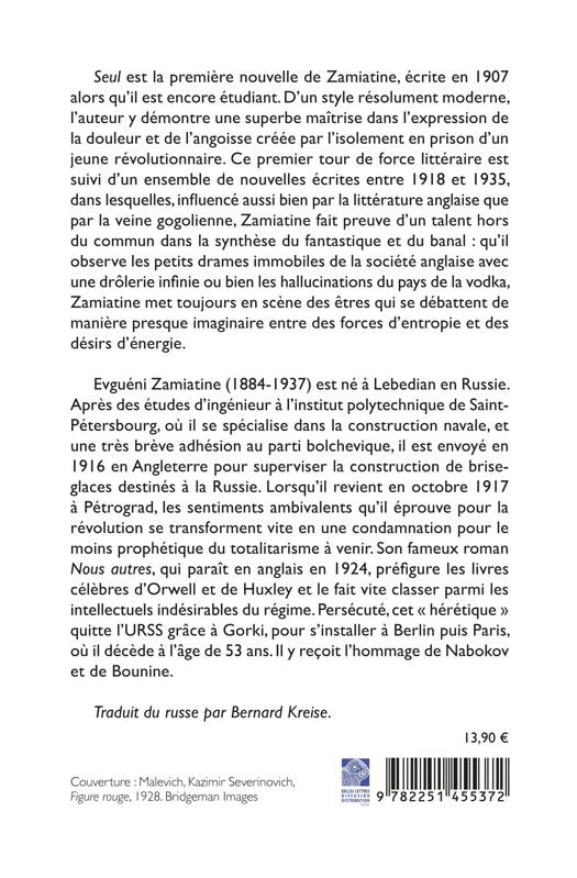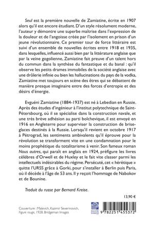 Seul est la première nouvelle de Zamiatine, écrite en 1907 alors qu’il est encore étudiant. D’un style résolument moderne, l’auteur y démontre une superbe maîtrise dans l’expression de la douleur et de l’angoisse créée par l’isolement en prison d’un jeune révolutionnaire. Ce premier tour de force littéraire est suivi d’un ensemble de nouvelles écrites entre 1918 et 1935, dans lesquelles, influencé aussi bien par la littérature anglaise que par la veine gogolienne, Zamiatine fait preuve d’un talent hors du commun dans la synthèse du fantastique et du banal : qu’il observe les petits drames immobiles de la société anglaise avec une drôlerie infinie ou bien les hallucinations du pays de la vodka, Zamiatine met toujours en scène des êtres qui se débattent de manière presque imaginaire entre des forces d’entropie et des désirs d’énergie.