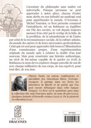 L'aventure du philosophe sans maître est universelle. Puisque personne ne peut apprendre à notre place, chacun d'entre nous abrite en son intimité un naufragé seul pour appréhender le monde. D'Avicenne à Michel Tournier ce livre présente comment l'autodidacte, tel un Robinson en équilibre sur l'île des savoirs, se voit depuis toujours menacé d'un côté par le vertige de la folie, de la perdition, de la misanthropie et de l'autre par celui de la reconnaissance sociale, de la culture admise, du monde des autres et de leurs nécessaires gesticulations. Celui qui est seul pour apprendre, doit trouver l'illumination d'une connaissance propre, d'une expérimentation originale du monde apte à éclairer la réalité d'un jour nouveau. Mais pour construire une histoire authentique, un récit de lui-même capable de le garder en éveil, le Robinson en nous devra explorer chaque parcelle de son île avec chaque millimètre de son corps, de son esprit et pour tout dire de son âme.