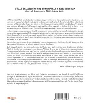 « Même si José Marti écrivit abondamment dans les genres littéraires et journalistiques les plus divers... les journaux de voyages furent de toute évidence un de ses exercices favoris... le fleuron en étant bien entendu les journaux qu’il tint en 1895 durant son séjour en République dominicaine et Haïti, puis à Cuba qu’il rejoignit pour participer à la guerre d’Indépendance qu’il avait lui-même organisée et déclenchée le 24 février : cinq semaines de marche difficile à travers l’Est de l’île jusqu’au 19 mai où il tomba au champ d’honneur. ... Comme dans ses autres travaux, Bonaldi ne se contente pas de nous livrer une excellente traduction qui sait conserver des aspects aussi difficiles et caractéristiques que les traits stylistiques et la richesse idiomatique de Marti : il nous offre de surcroît une grande quantité d’informations et d’analyses qui contribuent notablement à rendre ces journaux de Marti compréhensibles pour quiconque ne possède pas une connaissance poussée de l’auteur et de leur contexte. Aux intelligentes remarques de son Introduction, à ses nombreuses notes clarifiantes, Bonaldi ajoute une série d’annexes qui démontrent sa brillante sagacité comme chercheur... Belle trouvaille de titre que cette exclamation de Marti... alors qu’il vient tout juste de débarquer à Cuba : “Seule la lumière est comparable à mon bonheur” ! Étant de ceux qui le fréquentent, nous connaissons l’importance de la lumière chez Marti comme symbole propice. Quelle meilleure manière, donc, d’exprimer cette félicité qu’il éprouve à revenir dans la patrie après presque dix-sept ans d’absence et à commencer à remplir son devoir, risqué mais incontournable, au milieu de la guerre qu’il a su déclencher grâce à son talent d’organisateur et à sa passion véhémente ! Oui, que de lumière, que de bonheur dans ces journaux qui racontent des vicissitudes physiques et morales, où il parle en sociologue, en anthropologue et en philosophe, en observateur aimable et perspicace de peuples frères et d’autres êtres humains. Ces journaux sont le don de soi d’un homme tout d’une pièce, définitivement heureux. » Pedro Pablo Rodriguez, Prologue