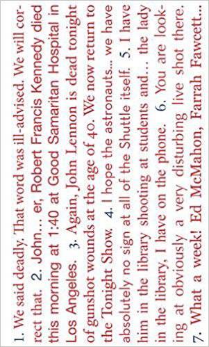 What are the words we use to describe something that we never thought we'd have to describe? In Seven American Deaths and Disasters, Kenneth Goldsmith transcribes historic radio and television reports of national tragedies as they unfurl, revealing an extraordinarily rich linguistic panorama of passionate description. Taking its title from the series of Andy Warhol paintings by the same name, Goldsmith recasts the mundane as the iconic, creating a series of prose poems that encapsulate seven pivotal moments in recent American history: the John F. Kennedy, Robert F. Kennedy, and John Lennon assassinations, the space shuttle Challenger disaster, the Columbine shootings, 9/11, and the death of Michael Jackson. While we've become accustomed to watching endless reruns of these tragic spectacles-often to the point of cliche-once rendered in text, they become unfamiliar, and revealing new dimensions emerge. Impartial reportage is revealed to be laced with subjectivity, bias, mystery, second-guessing, and, in many cases, white-knuckled fear. Part nostalgia, part myth, these words render pivotal moments in American history through the communal lens of media.