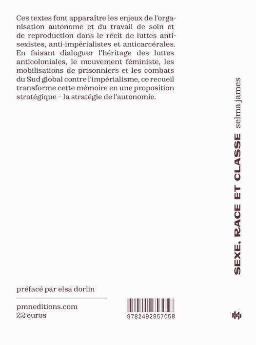 Ce livre rassemble six décennies de mobilisations internationales, d'expériences politiques et d'analyses. Selma James, en défendant l'autonomie des luttes de chaque secteur de la classe ouvrière, y encourage la multiplicité des oppositions au capitalisme et à l'État, reflet nécessaire des divisions qui nous séparent encore. Prenant comme point de départ les situations des femmes non salariées, travailleuses dans les foyers et dans les champs mais politiquement et stratégiquement exclues du mouvement ouvrier, elle développe cette stratégie de l'autonomie depuis les années 60'. Ces textes font apparaître les enjeux de l'organisation autonome, du travail de soin et de reproduction dans le récit des luttes antisexistes, anti-impérialistes et anticarcérales. En faisant dialoguer l'héritage des luttes anticoloniales, le mouvement féministe, les mobilisations de prisonniers et les combats du Sud global contre l'impérialisme, ce recueil transforme cette mémoire en une proposition stratégique.