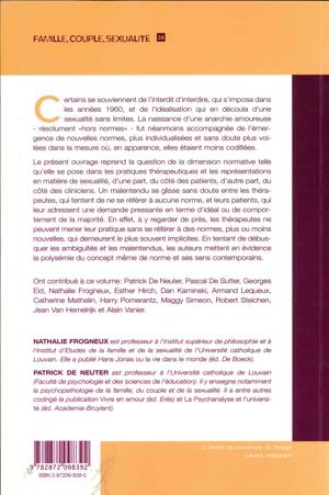 L'ouvrage traite de la dimension normative des pratiques et des représentations en matière de sexualité, du point de vue des cliniciens. Quelles demandes leur sont adressées aujourd'hui en matière de sexualité? Quelles questions entendent-ils derrière celles-ci? Comment y répondent-ils? Quels sont les repères et/ou références théoriques sur lesquels il s'appuient pour ce faire?