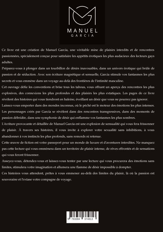 Ce livre est une création de Manuel Garcia, une véritable mine de plaisirs interdits et de rencontres passionnées, spécialement conçue pour satisfaire les appétits érotiques les plus audacieux des lecteurs gays adultes.Prépare-toi à te plonger dans un tourbillon de désirs inavouables, dans un univers érotique qui brûle de passion et de séduction. Avec son écriture magnétique et sensuelle, Garcia stimule tes fantasmes les plus secrets, t'emmenant dans un voyage au-delà des frontières de l'intimité masculine.Cet ouvrage défie les conventions et brise tous les tabous, t'offrant un aperçu des rencontres les plus explosives, des connexions les plus profondes et des plaisirs les plus extatiques. Les pages de ce livre révèlent des histoires qui te tiendront collé aux mots, éveillant un désir que tu ne pourras pas ignorer.Laisse-toi emporter dans des mondes inconnus, où le péché est le moteur des émotions les plus intenses. Les personnages créés par García se révèlent dans des rencontres transgressives, dans des moments de passion débridée, dans une symphonie de désir qui enflamme tes fantasmes les plus sombres.L'écriture provocante et détaillée de Manuel García est une explosion de sensualité qui te fera frissonner de plaisir. À travers ses histoires, il t'invite à explorer ta sexualité sans inhibitions, à t'abandonner à tes instincts les plus profonds, sans remords ni retenue.Cette oeuvre de fiction est ton passeport pour un monde de luxure et d'aventures interdites. Ne manque pas cette lecture qui t'emmènera dans un territoire de plaisir intense, de rêves effrontés et de sensations qui te feront frissonner.Assieds-toi, détends-toi et laisse-toi aller à une lecture qui te procurera des émotions sans limites, stimulera ton imagination et allumera une flamme de désir qui ne peut être apprivoisée.Ces histoires t'attendent, prêtes à t'emmener au-delà des limites du plaisir, là où la passion est souveraine et où l'extase est ton compagnon de voyage.