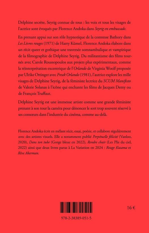 Delphine secrète, Seyrig connue de tous : les voix et tous les visages de l'actrice sont évoqués par Florence Andoka dans Seyrig en embuscade. En prenant appui sur son rôle hypnotique de la comtesse Bathory dans Les Lèvres rouges (1971) de Harry Kümel, Florence Andoka élabore dans un récit queer et gothique une traversée somnambulique et vampirique de la filmographie de Delphine Seyrig. Du militantisme des films tournés avec Carole Roussopoulos aux projets plus expérimentaux, comme la réinterprétation excentrique de l'Orlando de Virginia Woolf proposée par Ulrike Ottinger avec Freak Orlando (1981), l'autrice explore les mille visages de Delphine Seyrig, de la féministe lectrice du SCUM Manifesto de Valerie Solanas à l'icône qui enchante les films de Jacques Demy ou de François Truffaut. Delphine Seyrig est une immense artiste comme une grande féministe prenant à son tour la caméra pour dénoncer le sort trop souvent réservé à ses consÅurs dans l'industrie du cinéma, comme au-delà.
