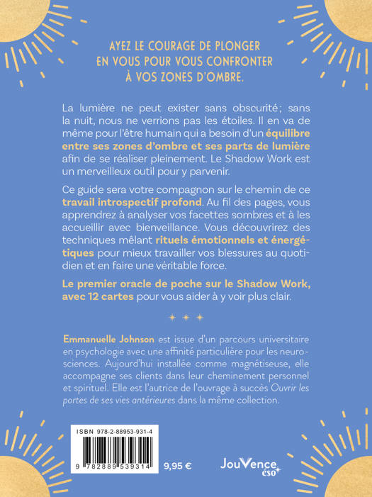 Ayez le courage de plonger en vous pour vous confronter à vos zones d’ombre. La lumière ne peut exister sans obscurité ; sans la nuit, nous ne verrions pas les étoiles. Il en va de même pour l’être humain qui a besoin d’un équilibre entre ses zones d’ombre et ses parts de lumière afin de se réaliser pleinement. Le Shadow Work est un merveilleux outil pour y parvenir. Ce guide sera votre compagnon sur le chemin de ce travail introspectif profond. Au fil des pages, vous apprendrez à analyser vos facettes sombres et à les accueillir avec bienveillance. Vous découvrirez des techniques mêlant rituels émotionnels et énergétiques pour mieux travailler vos blessures au quotidien et en faire une véritable force. Le premier oracle de poche sur le Shadow Work, avec 12 cartes pour vous aider à y voir plus clair.