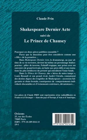 Dans Shakespeare dernier acte, le dramaturge, au jour ultime de sa vie terrestre, devient lui-même un personnage shakespearien : pilier de taverne, Falstaff tragique, aux prises avec ses souvenirs de grand écrivain, en butte aux pires défis et aux tentations les plus médiocres. Dans Le Prince de Chausey, des « héros de notre temps », Louis Renault et son grand rival, André Citroën, connaissent des destins dignes des tragédies de Shakespeare : ascension, chute, conséquence de comportements individuels discutables et d'événements extérieurs, dévastateurs…