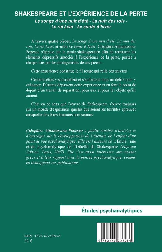 Cléopâtre Athanassiou-Popesco s'appuie sur le génie shakespearien afin de retrouver les éléments dépressifs associés à l'expérience de la perte, portée à chaque fois par les protagonistes de ces pièces. Cette expérience constitue le fil rouge qui relie ces oeuvres. C'est en ce sens que l'oeuvre de Shakespeare s'ouvre toujours sur un monde d'espérance, quelles que soient les terribles épreuves auxquelles les êtres humains sont soumis.