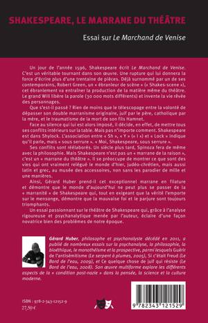 Dans la continuité de son travail de recherche sur " la condition post nazi ", ce dernier essai de Gérard Huber analyse ce qui se révèle lorsque l'on met en scène aujourd'hui Le Marchand de Venise. En s'appuyant sur la signification cachée des noms des personnages ( Shylock/ Shakespeare ), il montre l'existence d'un double marranisme (au XVI siècle est " marrane " tout juif converti de force au catholicisme et qui pratique en secret sa religion) chez Shakespeare qui sera déterminant dans l'évolution de sa pulsion théâtrale.
