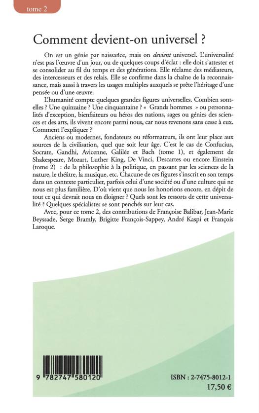 L'humanité compte quelques grandes figures universelles. Combien sont-elles ? Elles vivent encore parmi nous, car nous revenons sans cesse à elles. Comment l'expliquer ? Anciens ou modernes, fondateurs ou réformateurs, ces "grands hommes" ont leur place aux sources de la civilisation quel que soit leur âge. C'est le cas de Confucius, Socrate, Gandhi, Avicenne, Galilée et Bach (tome 1) et également de Shakespeare, Mozart, Luther King, De Vinci, Descartes et Einstein (tome 2). D'où vient que nous les honorions encore, en dépit de tout ce qui devrait nous en éloigner ? Quels sont les ressorts de cette universalité ?