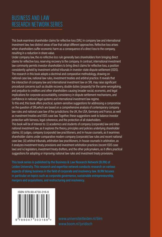 This book examines shareholder claims for reflective loss (SRL) in company law and international investment law, two distinct areas of law that adopt different approaches. Reflective loss arises when shareholders suffer economic harm as a consequence of a direct loss to the company, resulting in a reduction in share value. Under company law, the no reflective loss rule generally bars shareholders from bringing direct claims for reflective loss, reserving recovery to the company. In contrast, international investment law commonly permits investor-shareholders to bring direct claims for reflective loss, a position consistently upheld by investment arbitral tribunals in investor–state dispute settlement (ISDS). The research in this book adopts a doctrinal and comparative methodology, drawing on national case law, national law rules, investment treaties and arbitral practice. It reveals that the interaction of company law and international investment law on SRL may raise significant procedural concerns such as double recovery, double duties (jeopardy) for the same wrongdoing, and prejudice to creditors and other shareholders causing broader social, economic, and legal implications for corporate accountability, consistency in dispute settlement mechanisms, and confidence in national legal systems and international investment law regime. To this end, this book offers practical, system-sensitive suggestions for addressing a compromise on the question of SRLwhich are based on a comprehensive analysis of contemporary company law rules and national case law of the jurisdictions: the UK, the USA, Germany and France, as well as investment treaties and ISDS case law. Together, these suggestions seekto balance investor protection with fairness, legal coherence, and the protection of all stakeholders. This book will be of interest to: (i) academics and students of company (corporate) law and international investment law, as it explores the theory, principles and policies underlying shareholder claims; (ii) judges, company (corporate) law practitioners, and in-house counsels, as it examines shareholder claims under comparative modern company (corporate) law rules and recent national case law; (iii) arbitral tribunals, arbitration law practitioners, in-house counsels in arbitration, as it analyzes investment treaty provisions and investment arbitration practices (recent ISDS case law) and iv) legislators, investment treaty drafters, and the other policymakers, as it offers practical suggestions for adopting or improving national law rules and investment treaty provisions. This book series is published by the Business & Law Research Network (BLRN) of Leiden University. This research and expertise network conducts research on various aspects of doing business in the field of corporate and insolvency law. BLRN focuses in particular on topics such as corporate governance, sustainable entrepreneurship, mergers and acquisitions, and restructuring and insolvency.
