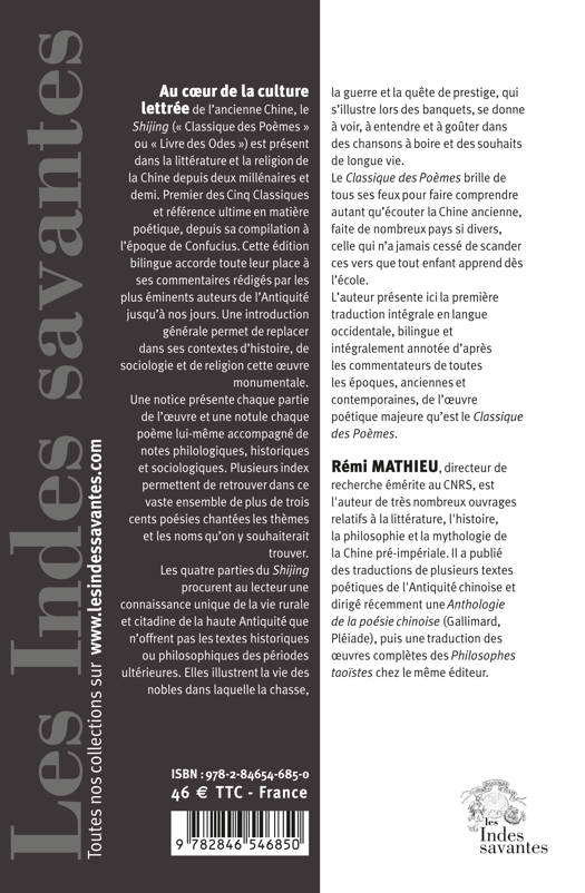 Au coeur de la culture lettrée de l’ancienne Chine, le Shijing (« Classique des Poèmes » ou « Livre des Odes ») est présent dans la littérature et la religion de la Chine depuis deux millénaires et demi. Premier des Cinq Classiques et référence ultime en matière poétique, depuis sa compilation à l’époque de Confucius. Cette édition bilingue accorde toute leur place à ses commentaires rédigés par les plus éminents auteurs de l’Antiquité jusqu’à nos jours. Une introduction générale permet de replacer dans ses contextes d’histoire, de sociologie et de religion cette oeuvre monumentale.