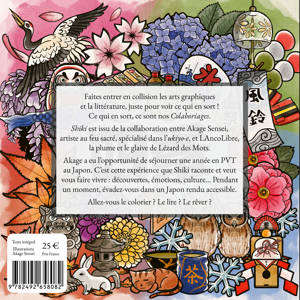 Faites entrer en collision les arts graphiques et la littérature, juste pour voir ce qui en sort ! Ce qui en sort, ce sont nos Colaboriages. Shiki est issu de la collaboration entre Akage Sensei, artiste au feu sacré, spécialisé dans l’ukiyo-e, et LAncoLibre, la plume et le glaive de Lézard des Mots. Akage a eu l’opportunité de séjourner une année en PVT au Japon. C’est cette expérience que Shiki raconte et veut vous faire vivre : découvertes, émotions, culture… Pendant un moment, évadez-vous dans un Japon rendu accessible. Allez-vous le colorier ? Le lire ? Le rêver ?