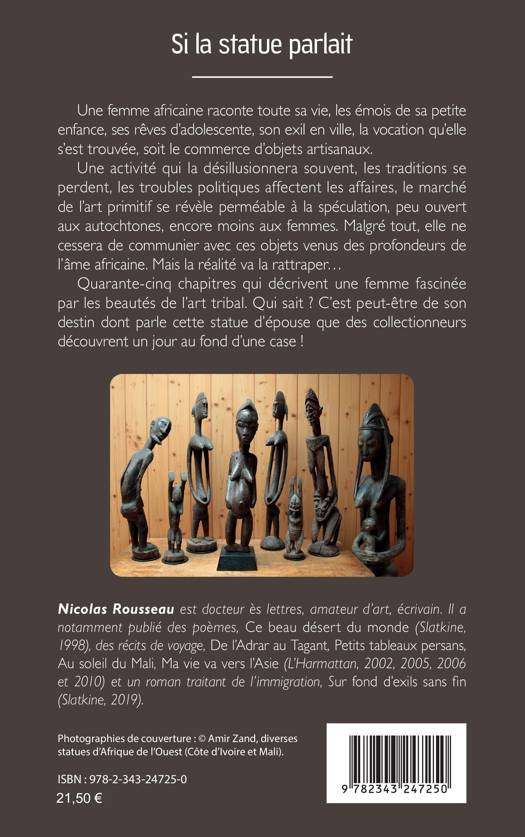 Une femme africaine raconte toute sa vie, les émois de sa petite enfance, ses rêves d’adolescente, son exil en ville, la vocation qu’elle s’est trouvée, soit le commerce d’objets artisanaux. Une activité qui la désillusionnera souvent, les traditions se perdent, les troubles politiques affectent les affaires, le marché de l’art primitif se révèle perméable à la spéculation, peu ouvert aux autochtones, encore moins aux femmes. Malgré tout, elle ne cessera de communier avec ces objets venus des profondeurs de l’âme africaine. Mais la réalité va la rattraper... Quarante-cinq chapitres qui décrivent une femme fascinée par les beautés de l’art tribal. Qui sait ? C’est peut-être de son destin dont parle cette statue d’épouse que des collectionneurs découvrent un jour au fond d’une case !