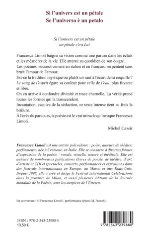 Francesca Limoli baigne sa vision comme une parure dans les éclats et les méandres de la vie. Elle attente au quotidien de son doigté. Les poèmes, successivement en italien et en français, serpentent sans bruit l’amour de l’amour. Est-ce la tradition mystique ou plutôt un saut à l’écart de sa coquille ? Le sang de l’esprit égare sa couleur pour celle de l’eau, plus fuyante et libre. On en arrive à confondre divinité et trace charnelle. La vérité prend toutes les formes qui la transcendent. Incantation, esquive de la séduction, ce texte intense tient au frais la brûlure. À l’orée du parcours, la poésie est le vrai miracle qu’invoque Francesca Limoli. - Michel Cassir