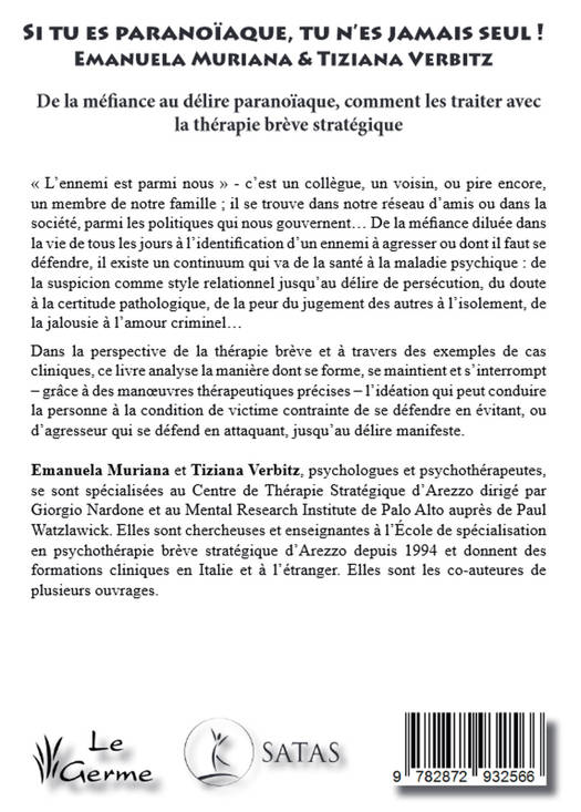 « L’ennemi est parmi nous » - c’est un collègue, un voisin, ou pire encore, un membre de notre famille ; il se trouve dans notre réseau d’amis ou dans la société, parmi les politiques qui nous gouvernent… De la méfiance diluée dans la vie de tous les jours à l’identification d’un ennemi à agresser ou dont il faut se défendre, il existe un continuum qui va de la santé à la maladie psychique : de la suspicion comme style relationnel jusqu’au délire de persécution, du doute à la certitude pathologique, de la peur du jugement des autres à l’isolement, de la jalousie à l’amour criminel… Dans la perspective de la thérapie brève et à travers des exemples de cas cliniques, ce livre analyse la manière dont se forme, se maintient et s’interrompt – grâce à des manoeuvres thérapeutiques précises – l’idéation qui peut conduire la personne à la condition de victime contrainte de se défendre en évitant, ou d’agresseur qui se défend en attaquant, jusqu’au délire manifeste. Emanuela Muriana et Tiziana Verbitz, psychologues et psychothérapeutes, se sont spécialisées au Centre de Thérapie Stratégique d’Arezzo dirigé par Giorgio Nardone et au Mental Research Institute de Palo Alto auprès de Paul Watzlawick. Elles sont chercheuses et enseignantes à l’École de spécialisation en psychothérapie brève stratégique d’Arezzo depuis 1994 et donnent des formations cliniques en Italie et à l’étranger. Elles sont les co-auteures de plusieurs ouvrages.