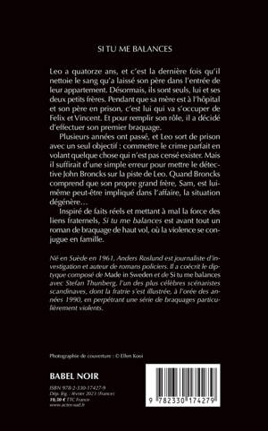 Leo a quatorze ans, et c'est la dernière fois qu'il nettoie le sang qu'a laissé son père dans l'entrée de leur appartement. Désormais, ils sont seuls, lui et ses deux petits frères. Pendant que sa mère est à l'hôpital et son père en prison, c'est lui qui va s'occuper de Felix et Vincent. Et pour remplir son rôle, il a décidé d'effectuer son premier braquage. Plusieurs années ont passé, et Leo sort de prison avec un seul objectif : commettre le crime parfait en volant quelque chose qui n'est pas censé exister. Mais il suffirait d'une simple erreur pour mettre le détective John Broncks sur la piste de Leo. Quand Broncks comprend que son propre grand frère, Sam, est lui-même peut-être impliqué dans l'affaire, la situation dégénère... Inspiré de faits réels et mettant à mal la force des liens fraternels, "Si tu me balances" est avant tout un roman de braquage de haut vol, où la violence se conjugue en famille.