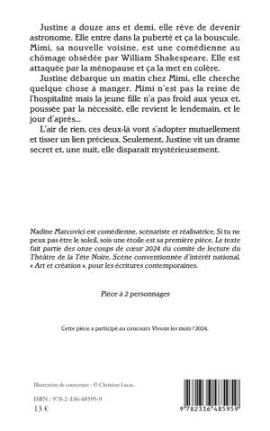 Justine a douze ans et demi, elle rêve de devenir astronome. Elle entre dans la puberté et ça la bouscule. Mimi, sa nouvelle voisine, est une comédienne au chômage obsédée par William Shakespeare. Elle est attaquée par la ménopause et ça la met en colère. Justine débarque un matin chez Mimi, elle cherche quelque chose à manger. Mimi n'est pas la reine de l'hospitalité mais la jeune fille n'a pas froid aux yeux et, poussée par la nécessité, elle revient le lendemain, et le jour d'après... L'air de rien, ces deux-là vont s'adopter mutuellement et tisser un lien précieux. Seulement, Justine vit un drame secret et, une nuit, elle disparait mystérieusement.