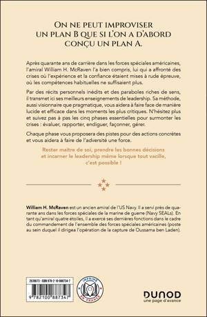 L’ouvrage fournit un ensemble d'outils pour faire face avec sérénité à ces moments de stress. Il décompose les crises en cinq phases - évaluer, signaler, contenir, façonner et gérer - et propose des mesures concrètes pour en sortir plus fort. Grâce à des histoires personnelles incroyables, des paraboles qui donnent à réfléchir et des leçons incontourables, l'amiral McRaven vous éclaire sur la façon dont vous pourrez vous montrer à la hauteur en temps de crise et agir en tant que leader, quelle que soit la situation.