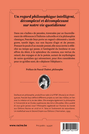 Dans ces « bulles » de pensées, traversées par un fourmillement de références à l'histoire culturelle et à la philosophie classique, Pascale Seys porte un regard « dézoomé », tantôt grave, tantôt léger, sur nos façons d'agir et de penser.