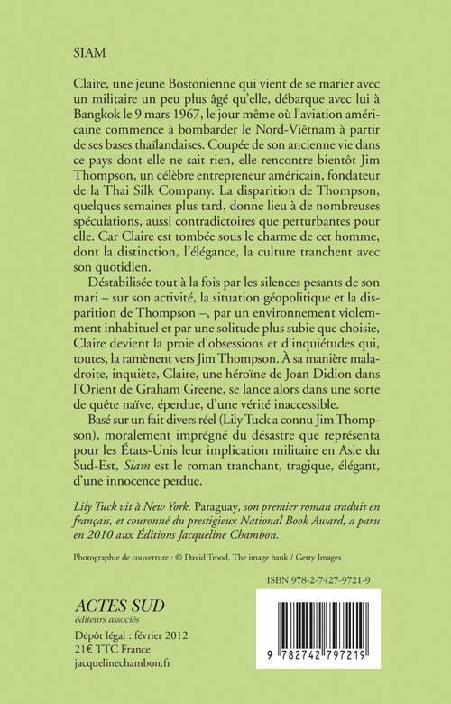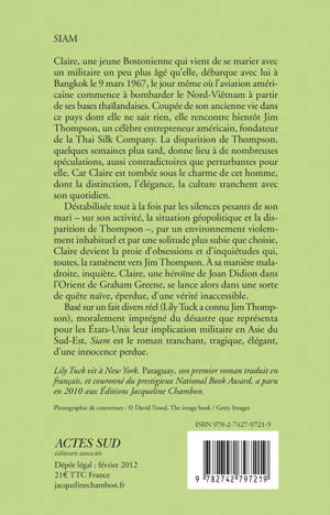 Basé sur un fait divers réel (Lily Tuck a connu Jim Thompson), moralement imprégné du désastre que représenta pour les États-Unis leur implication militaire en Asie du Sud-Est, «Siam »est le roman tranchant, tragique, élégant, d'une innocence perdue.