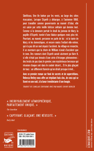 Skelthsea. Une île battue par les vents, au large des côtes écossaises. Lorsque Elspeth y débarque, à l’automne 1860, pour travailler comme gouvernante au manoir d’Iskar, elle est saisie par cette vieille bâtisse solitaire qui domine tout. Comme si la demeure portait le deuil du jumeau de Mary, la pupille d’Elspeth, tombé d’une falaise quelques mois plus tôt.